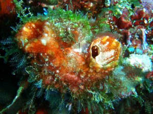 Grande ascidie solitaire au corps dressé en forme d’outre bien renflée, avec deux grands siphons faisant saillie. Quand ils sont ouverts, c’est grâce à eux que l’on repère l’ascidie, car en général le reste du corps est caché par de nombreux organismes: algues, hydraires. L’intérieur du siphon inhalant est équipé d’une couronne de tentacules effilés mais non ramifiés, contrairement à d’autres espèces, servant à retenir les particules trop grandes. De couleur orangée avec quelques traces blanches et brunes.