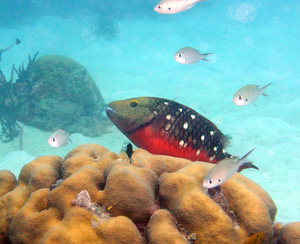 Taille maximum 50 cm. On rencontre ce grand perroquet sur les récifs et les zones rocheuses, plus rarement dans les herbiers, entre 2 et 50 mètres.