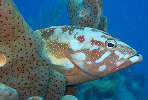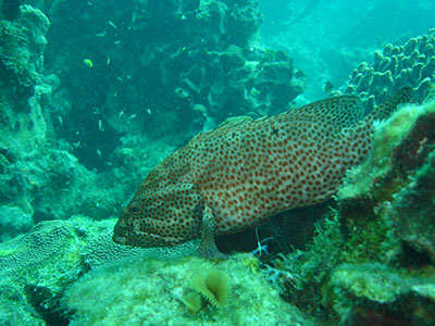 Mérou pouvant mesurer jusqu’à 70 cm. Les taches peuvent être espacées ou resserrées et varier du rouge au brun.