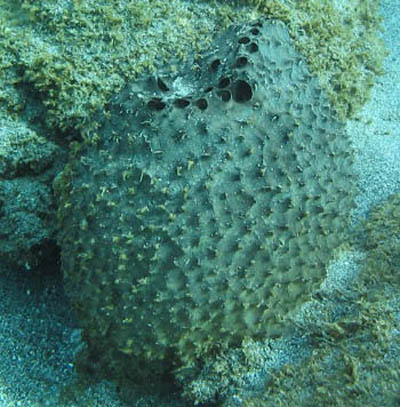 Ces éponges se présentent sous forme de boules irrégulières de 30 à 60 cm. Surface grise à « chair de poule » et oscules noirs regroupés, caractéristiques.