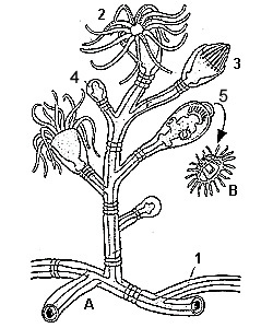Des polypes reproducteurs (5) peuvent former des méduses (B).