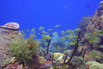 La vie récifale est d’une extraordinaire richesse : toutes les espèces fréquentent les récifs, des nudibranches bariolés aux espèces les plus grandes comme les requins, en passant par les éponges, les gorgones, les innombrables variétés de poissons multicolores, les poissons coffres, mérous, murènes, perroquets, diodons et autres langoustes et baracudas.