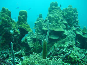 Plus bas, les madréporaires qui sont adaptés à des conditions de lumière minimales se présentent sous forme de grande plaques minces et horizontales, très fragile, mais sans risque à cette profondeur où les eaux sont calmes.