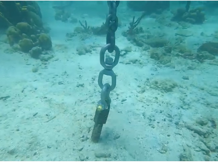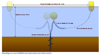 - disposer d’un point d’attache au fond (vis, corps mort) qui ne soit pas un élément du milieu naturel (on comprend bien que si on met une chaine autour d’un récif corallien, le récif va disparaitre et la chaine détruire tout ce qu’il y a autour),