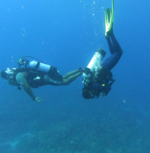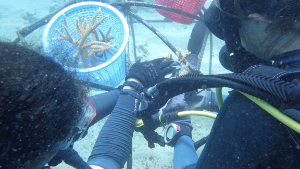 Nous mettons régulièrement en place des actions en plongée sous marines. Il peut s’agir d’observations comme l’observation des pontes de coraux qui ont lieu plusieurs jours dans l’année entre Aout et Octobre, mais aussi d’aussi du Reef Check (suivi bi-annuel de l’évolution de la vie marine autour de mêmes sites coralliens), ou d’un nettoyage de fond après un évènement particulier.